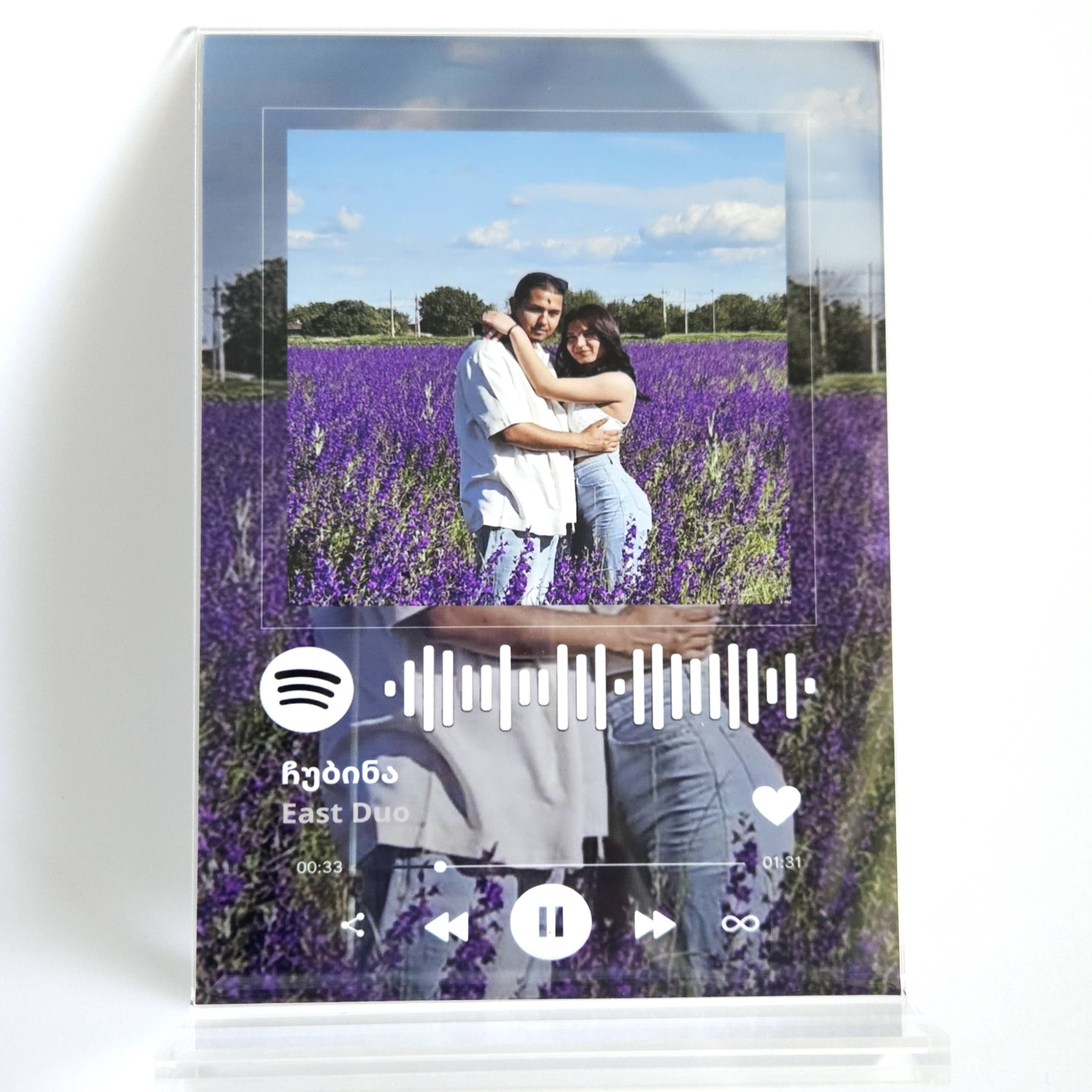 Персонализирана рамка с обложката на любима ваша снимка и песен, както и Spotify код, който ви позволява да слушате песента веднага. Размер 13 х 18 см. Насладете се на песента като сканирате QR кода чрез приложението Spotify. При поръчка ще се свържем с вас по Viber или имейл за уточняване снимката и песента.