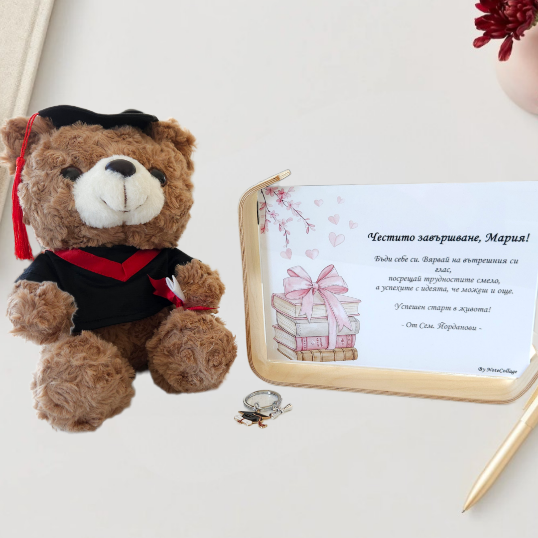Съдържание: Ключодържател за дипломиране, Плюшено мече с шапка за дипломиране и свитък, Персонализиран колаж за абитуриент с висококачествена рамка от дърво – размери 15 х 20 см. При поръчка ще се свържем с вас по Viber или имейл за уточняване на персонализацията.