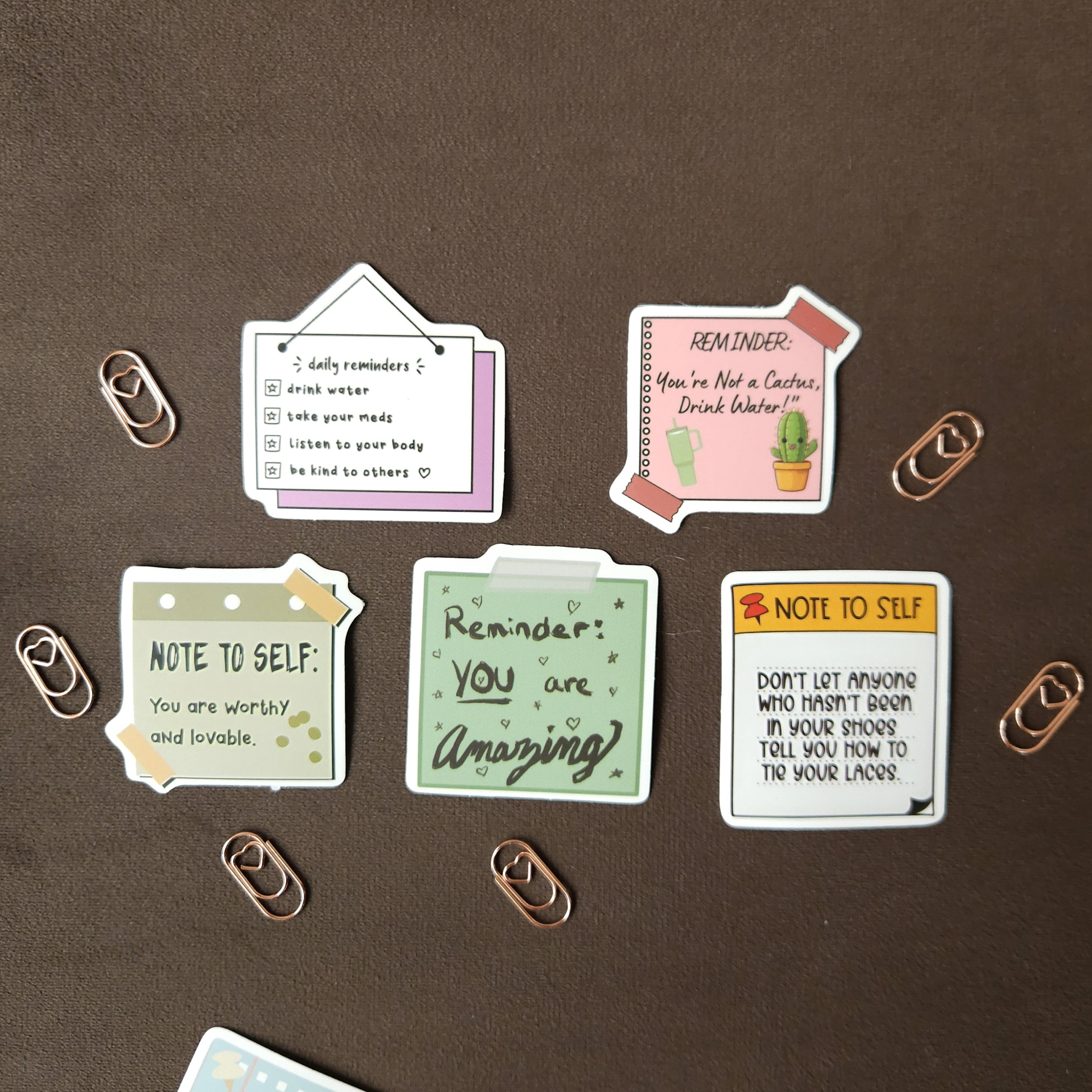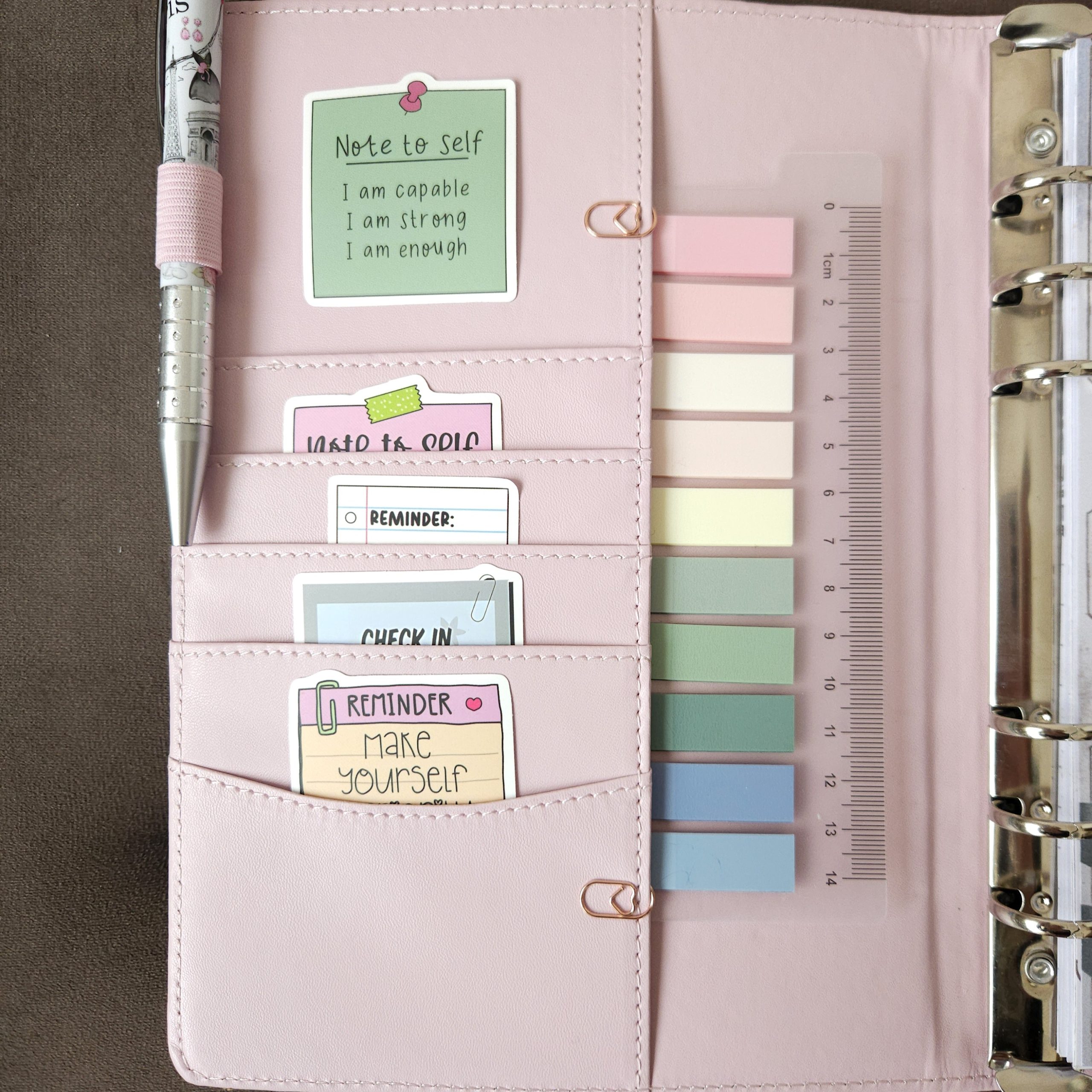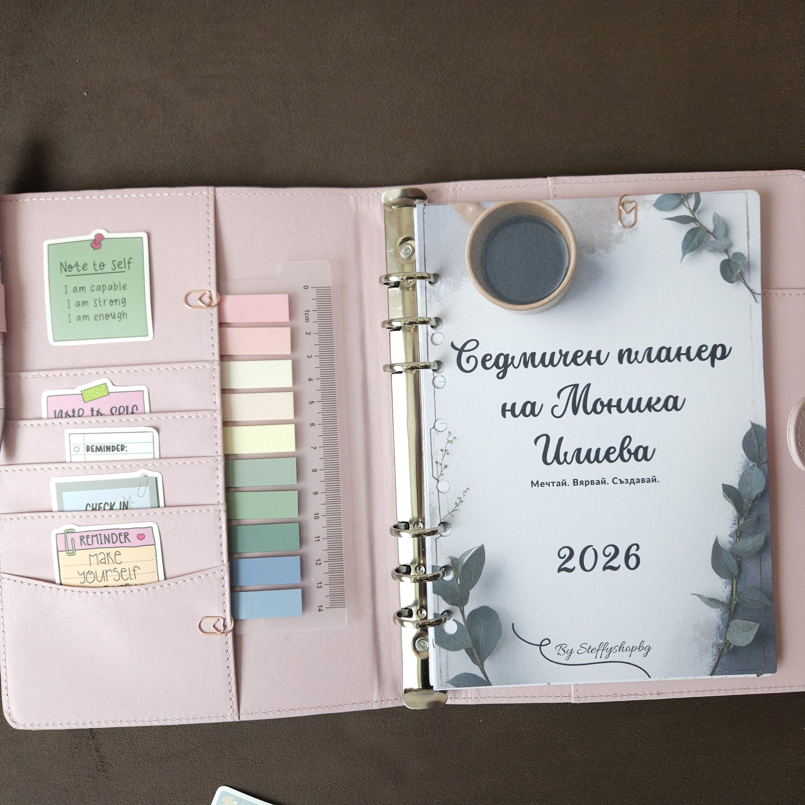 Формат А5 с 50 страници. С твърди корици и няколко джобчета. Получавате и като подарък – 5 бр. лепящи стикерчета с вдъхновяващи мисли, 6 бр. кламерчета сърце в цвят розово злато, както и комплект цветни лепящи листчета с линия. При поръчка ще се свържем с вас по Viber или имейл за уточняване на името, което на сложим на корицата. Изработването отнема до 5-7 дни.