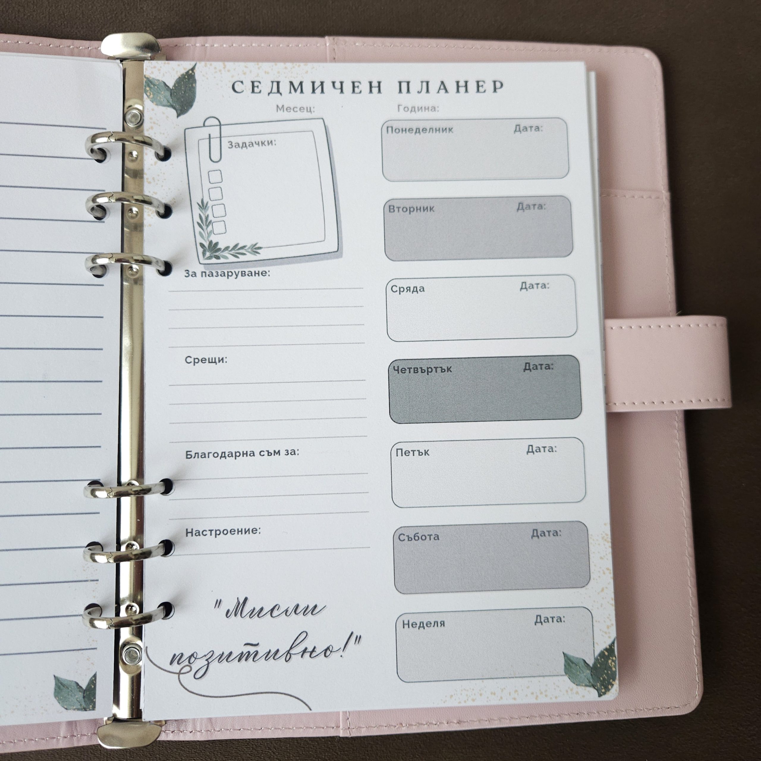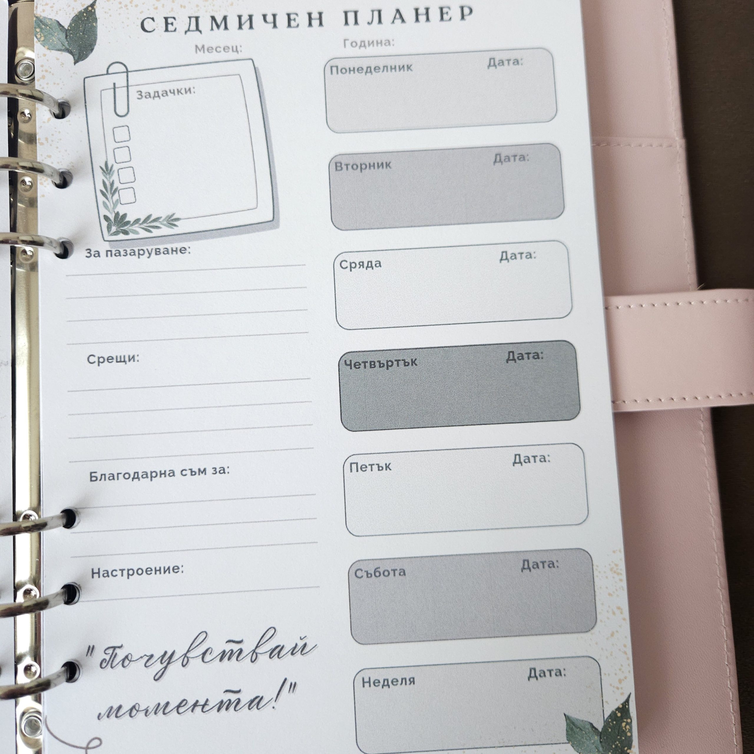 Персонализиран седмичен планер с вашето име и 24 вдъхновяващи мисли. Опакован с панделка и кутия.