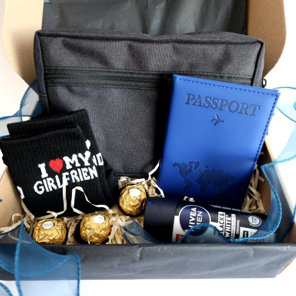 Възможно е леко отклонение на съдържанието спрямо наличността на продуктите. Съдържание: 1. Черен несесер за път; 2. Калъфче за паспорт; 3. Малък дезодорант Nivea; 4. Чорапи – I love my Girlfriend; 5. Бонбони Ferrero Rocher 4бр.