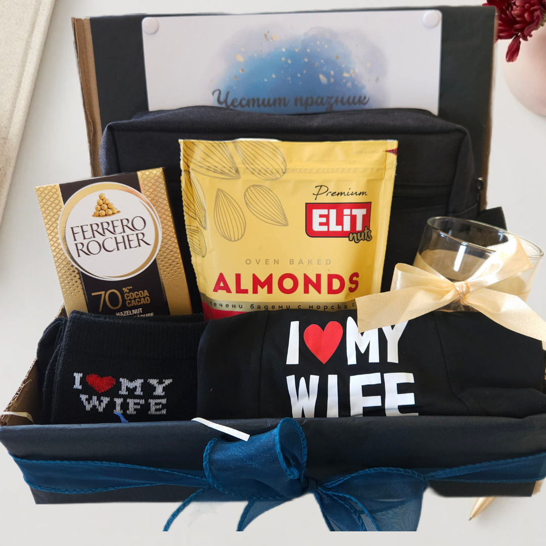 Възможно е леко отклонение на съдържанието спрямо наличността на продуктите. Съдържание: Персонализирана картичка в два варианта /По избор/; Чаша за уиски 180мл; Черен несесер за път; Печени бадеми с морска сол 120гр; Шоколад Ferrero Rocher; Мъжки Боксерки I Love My Wife; Мъжки Чорапи I My Love Wife.