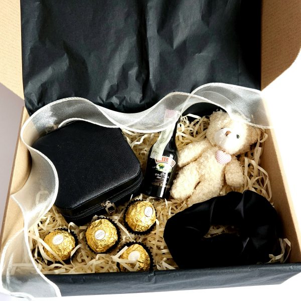 Възможно е леко отклонение на съдържанието спрямо наличността на продуктите. Съдържание: Кутия за бижута; Малко плюшено мече; Сатенено скрънчи за коса; Ликьор Baileys Original Irish Cream 50ml 17%; Бонбони Ferrero Rocher 4бр.