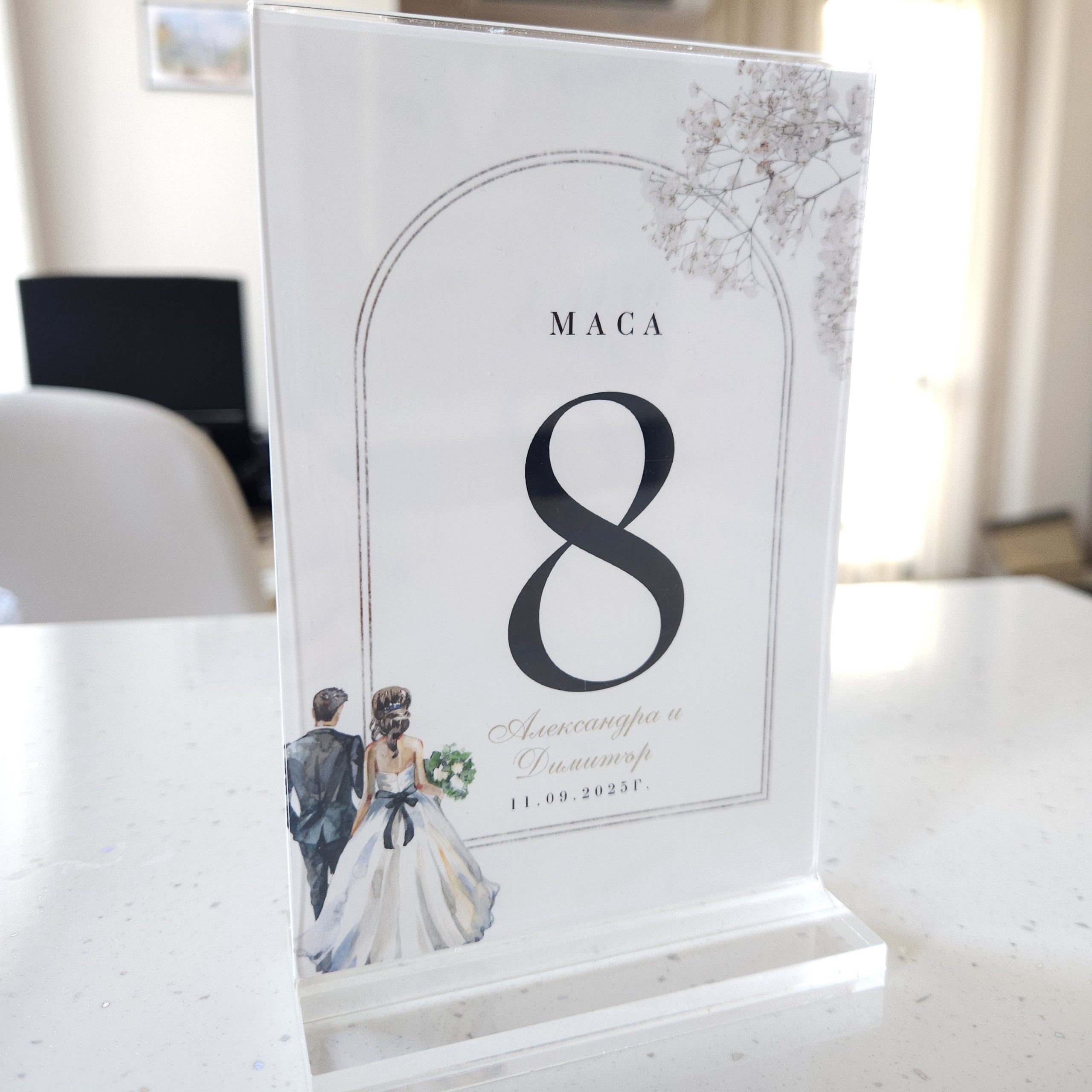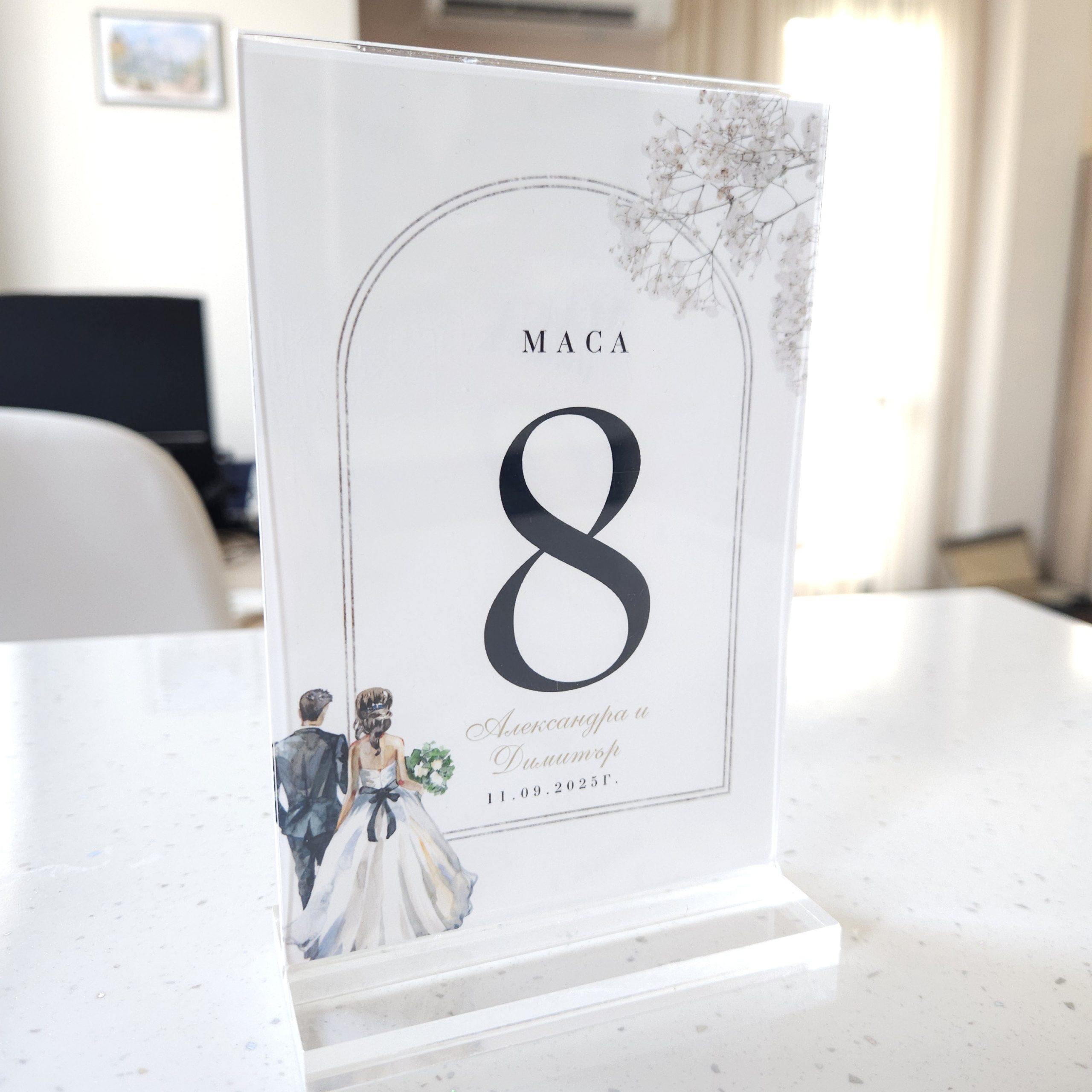 Персонализирана табела с номер на маса, имената на младоженците и дата. С прозрачна акрилна рамка. Размер 10 х 15 см. За двустранен печат се доплаща допълнително по 0,30 EUR/брой. При поръчка ще се свържем с вас по Viber или имейл за уточняване на текст и допълнения. Капаро в размер 50% е задължително, за да започнем изработката.
